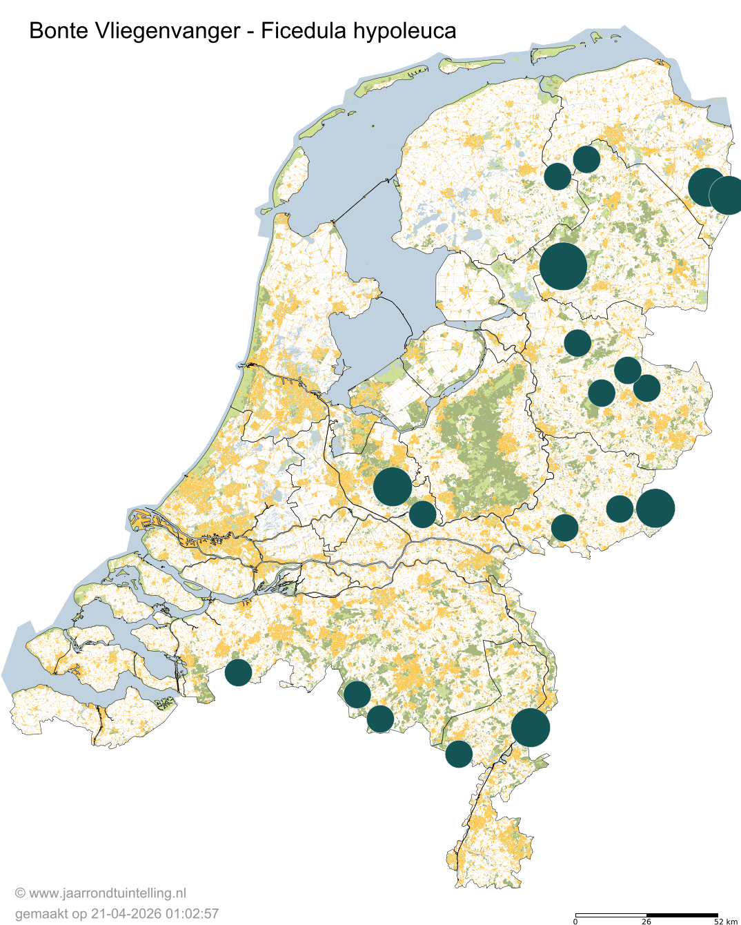 Op de kaart zie je per 5x5 km2 waar de soort is waargenomen in 2026.