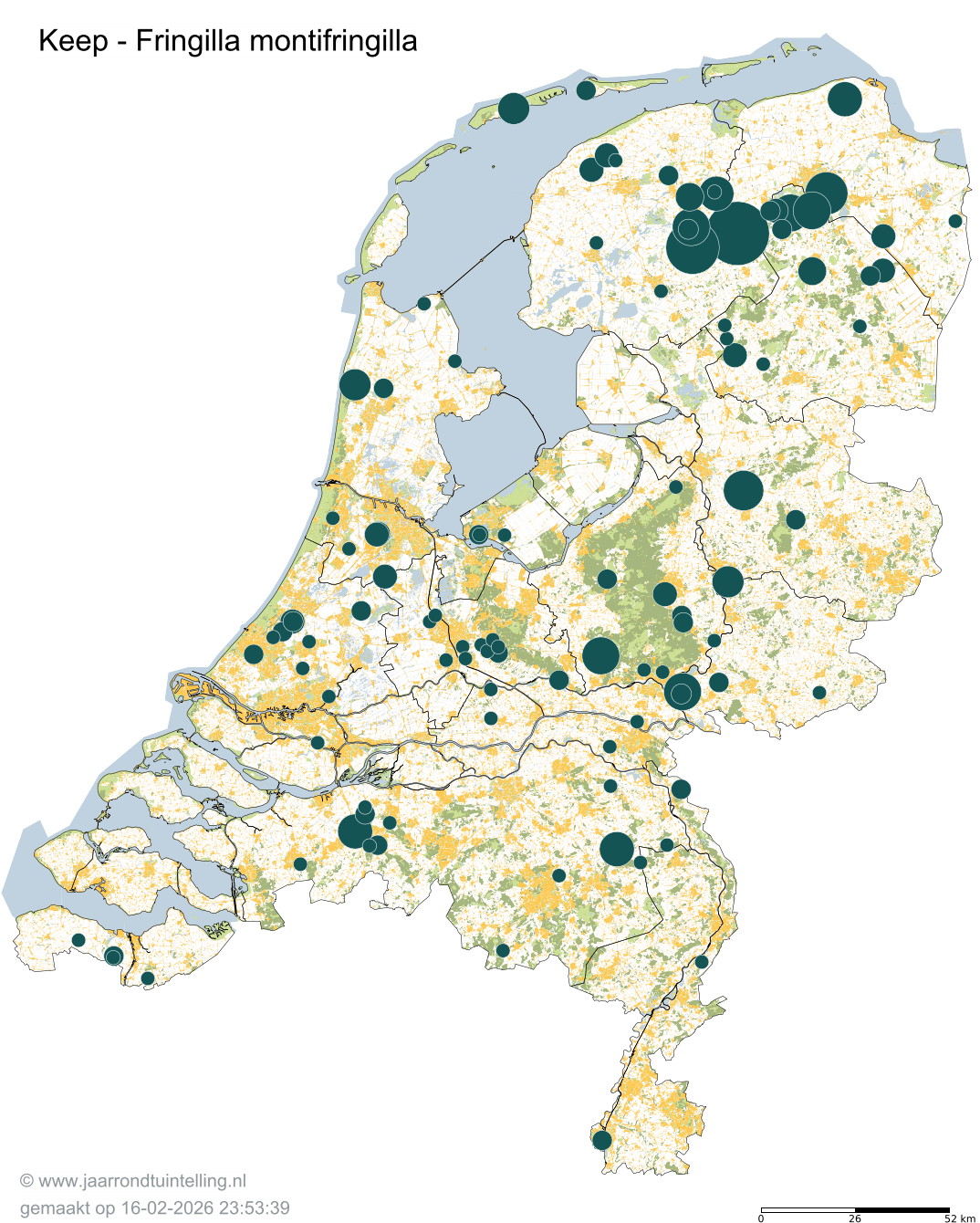 Op de kaart zie je per 5x5 km2 waar de soort is waargenomen in 2026.
