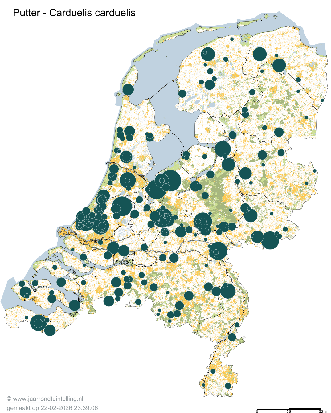 Op de kaart zie je per 5x5 km2 waar de soort is waargenomen in 2026.