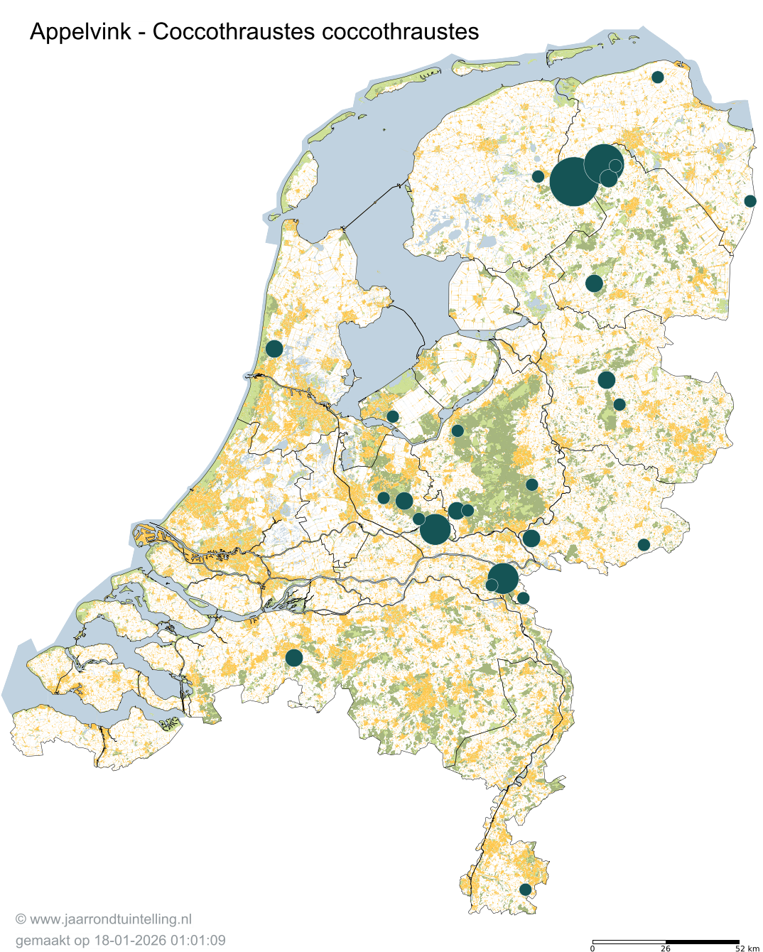 Op de kaart zie je per 5x5 km2 waar de soort is waargenomen in 2026.