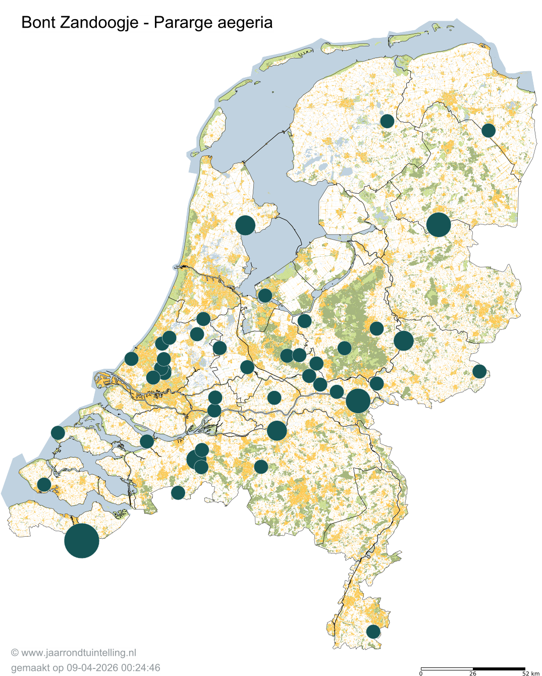 Op de kaart zie je per 5x5 km2 waar de soort is waargenomen in 2026.