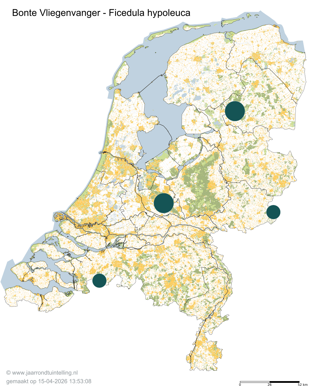 Op de kaart zie je per 5x5 km2 waar de soort is waargenomen in 2026.