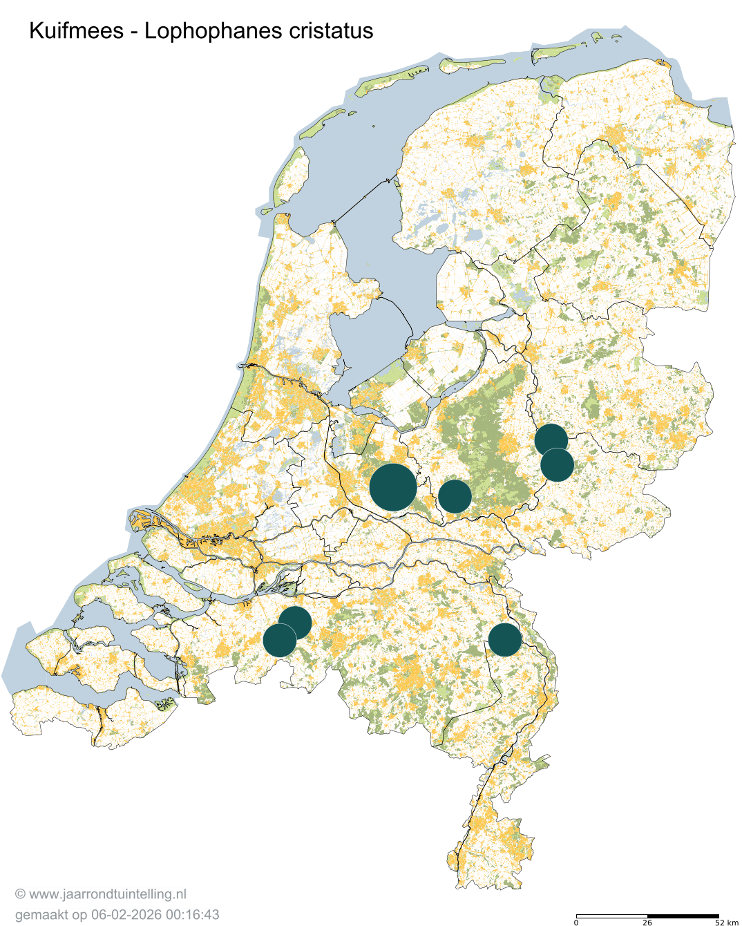 Op de kaart zie je per 5x5 km2 waar de soort is waargenomen in 2026.