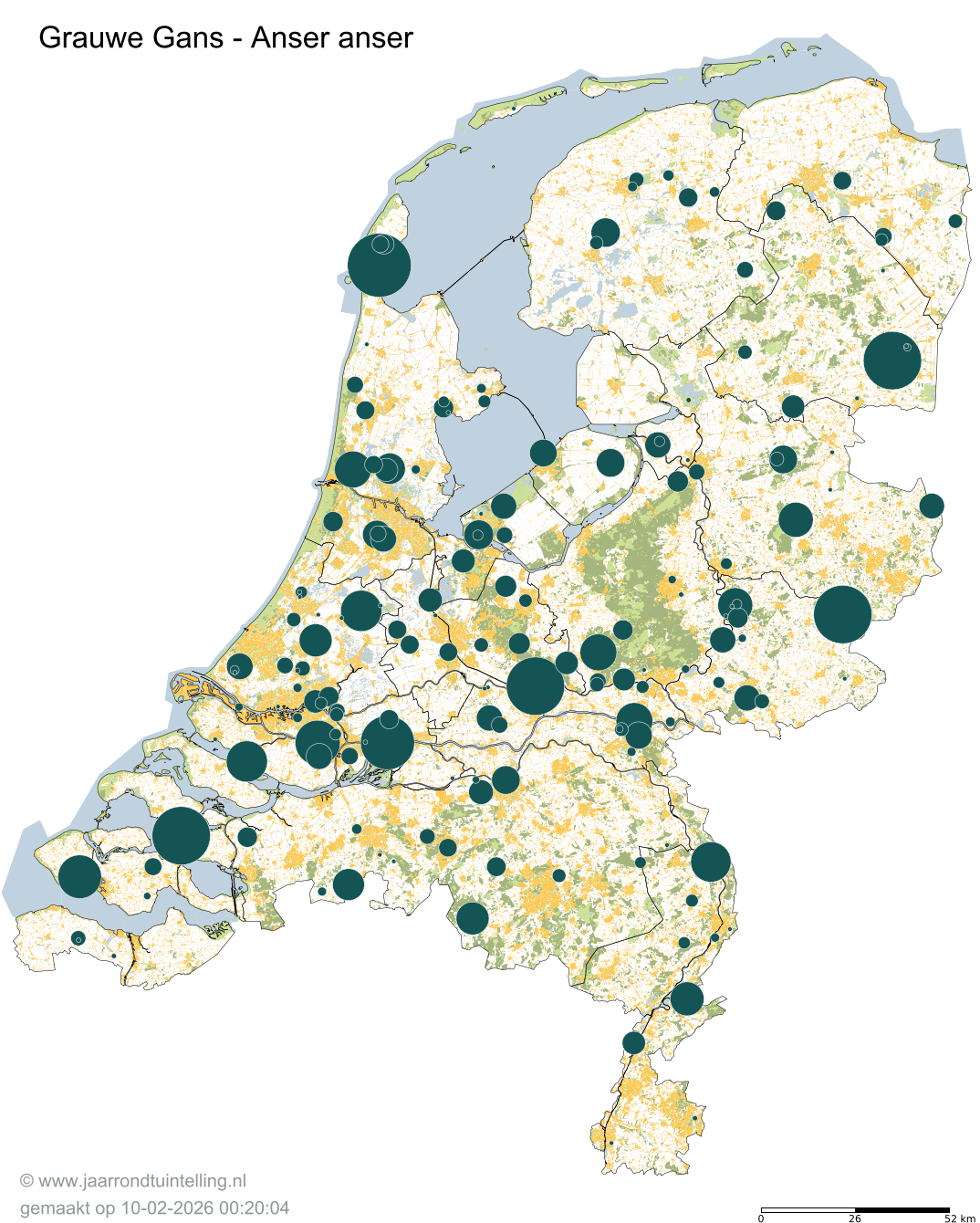 Op de kaart zie je per 5x5 km2 waar de soort is waargenomen in 2026.