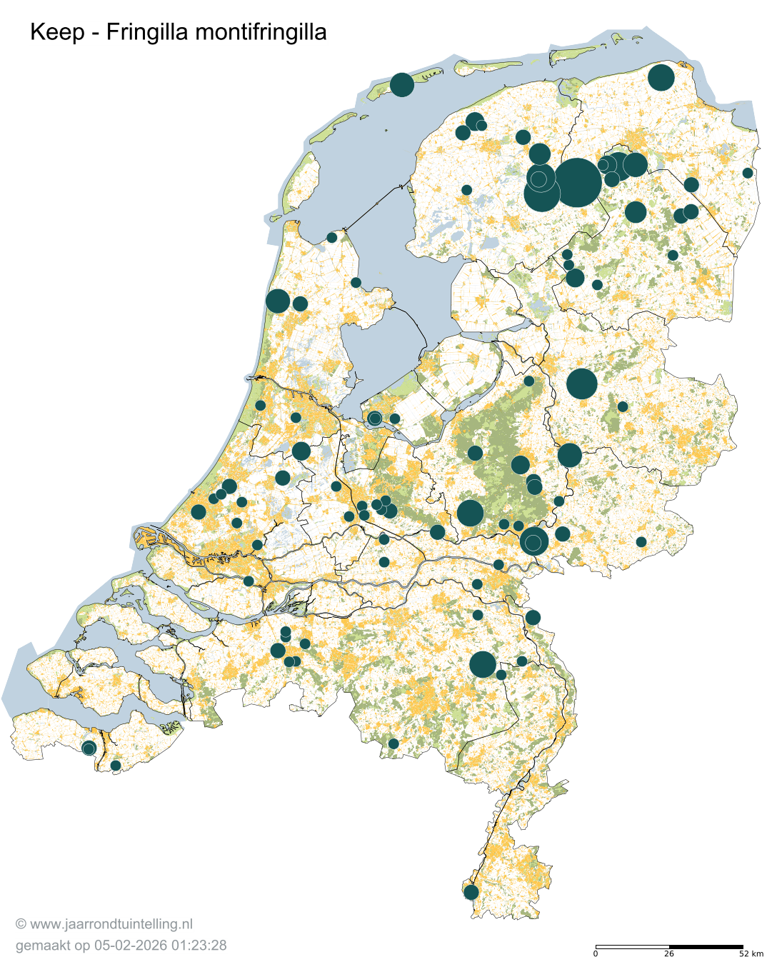 Op de kaart zie je per 5x5 km2 waar de soort is waargenomen in 2026.