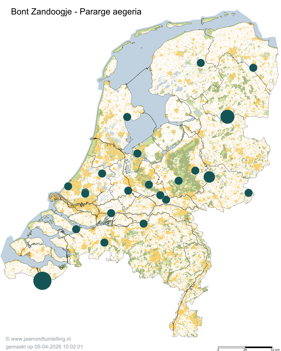 Op de kaart zie je per 5x5 km2 waar de soort is waargenomen in 2026.