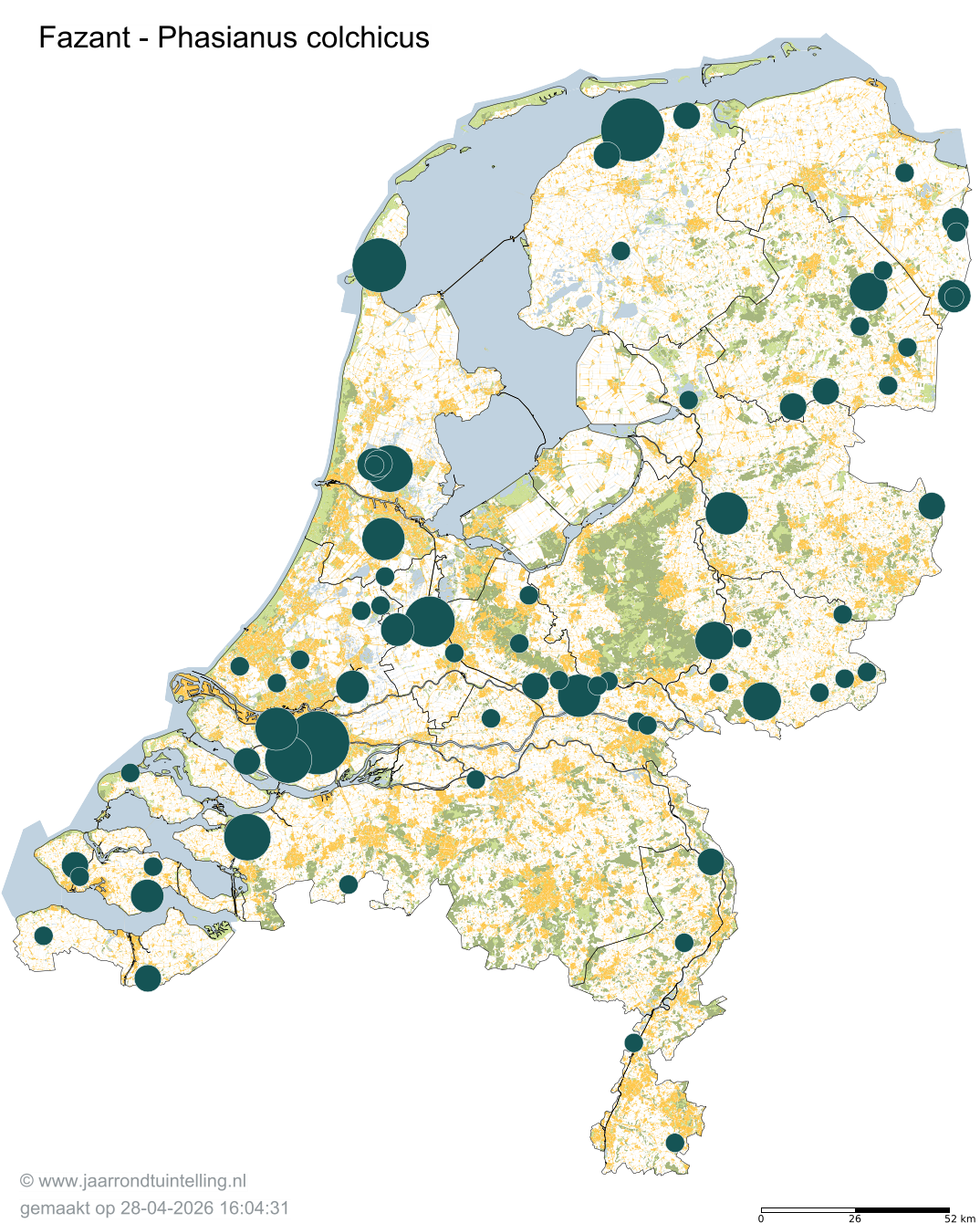 Op de kaart zie je per 5x5 km2 waar de soort is waargenomen in 2026.